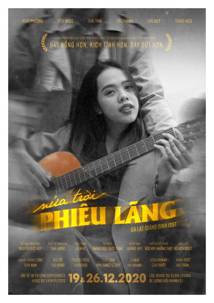 Giáng Sinh này, Đội Kịch BC&TT từ Khoa Báo Chí & Truyền Thông (ĐH KHXH&NV ĐHQG-HCM) thương mời quý khán giả thưởng thức vở diễn mới ‘NỬA TRỜI PHIÊU LÃNG’, được tái dựng từ kịch bản gốc ‘Cuối Trời Phiêu Lãng’, với ngàn lẻ một cung bậc cảm xúc khác nhau: vui, buồn, hạnh phúc, hờn giận, nuối tiếc, lo âu… Và cũng là để cùng chúng tôi (lần nữa) đi tìm câu trả lời cho câu hỏi: Sau tất cả, những nghệ sĩ lang thang liệu có lấp đầy được bao tử mình bằng tình yêu bất tận với nghệ thuật không? Những mộng mơ, hẹn ước một thời liệu có vượt qua được mọi thử thách để trở thành hiện thực không? Hay trách nhiệm và thực tế phũ phàng sẽ xóa nhòa và chia cắt tất cả?