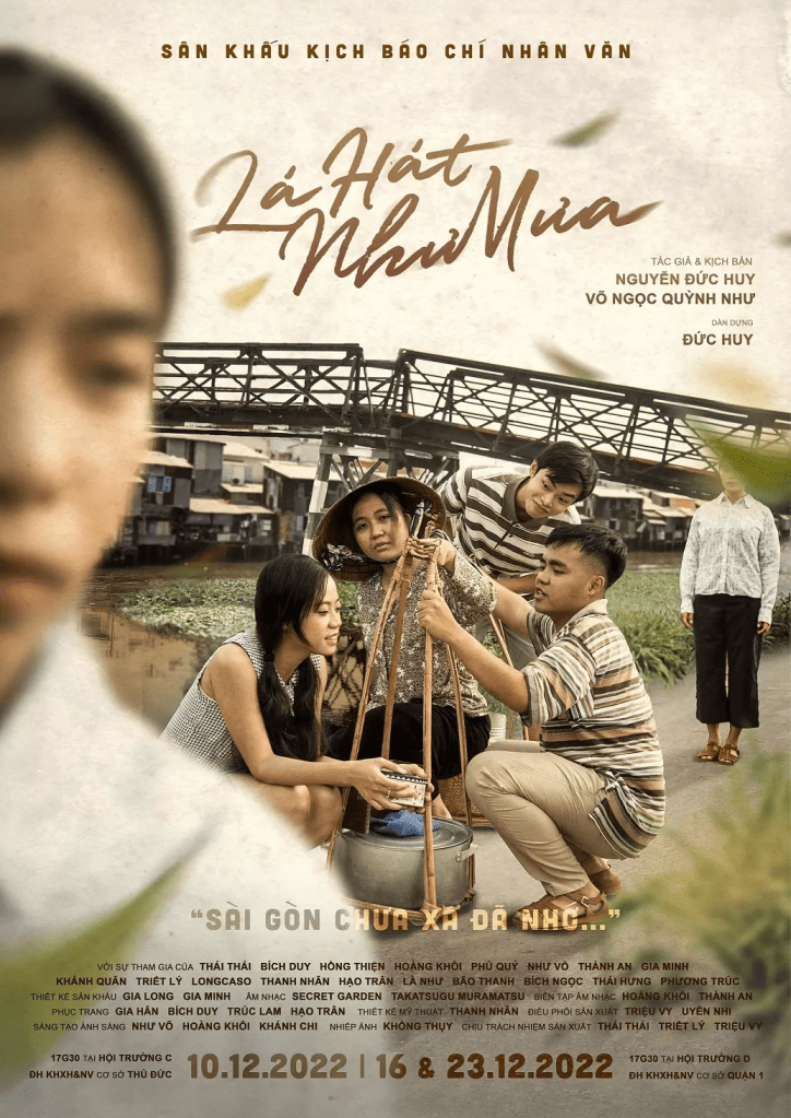 “Lá hát như mưa” là vở kịch dài thuộc dự án Sân Khấu Kịch Báo Chí Nhân Văn do CLB Kịch Khoa Báo chí & Truyền thông – Trường Đại học KHXH&NV TP.HCM sản xuất.